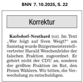 Was ist passiert? Die BNN haben unseren Gemeinderat und den stellvertretenden Bürgermeister Harald Weschenfelder fälschlicherweise der CDU zugeschrieben, was wir in der letzten Ausgabe scherzhaft kommentierten. Im selben Artikel hatten wir den Umzug von Harald und Helga Weschenfelder nach Neuthard mit „Karlsdorf Süd“ verortet. Wir hatten in der letzten Ausgabe hier einen - unseres Erachtens gut erkennbaren - Scherz gemacht. Genau so, in Anführungszeichen und, wenn man den gesamten Artikel mit der BNN-Korrektur liest, dann wurde deutlich, dass es sich um einen Scherz handelte. Den kann man nun gut finden und grinsen oder lachen, den kann man auch gerne ignorieren, beides ist ok für uns. Diesen Scherz mit einem Ortsteildenken - in diesem Fall „zu Lasten von Neuthard“ - zu bringen, ist für uns unverständlich.