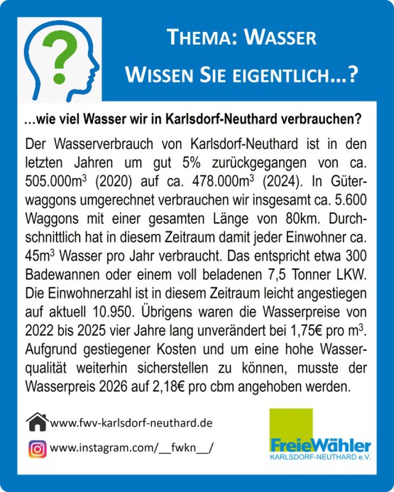 Unter dem Motto Wissen Sie eigentlich? hatten wir in der letzten Ausgabe eine neue Reihe gestartet. In loser Abfolge möchten wir alle Bürger*innen einladen, Interessantes rund um unsere Gemeinde zu erfahren und gerne auch mitzuraten. In der zweiten Auflage steht unser „Wasserverbrauch“ im Mittelpunkt.