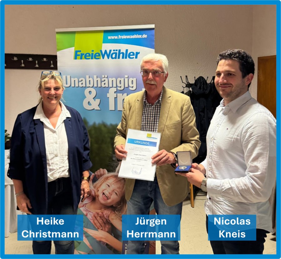 In der gut besuchten Jahreshauptver-sammlung der Freie Wähler Landkreis Karlsruhe e.V. in Ettlingen-Schöllbronn standen verschiedene Themen auf dem Programm. Mit Monika Herlan, Nicolas Kneis, Daniel Metz, Philipp Herlan und Klaus Brenner war unser Ortsverband bestens vertreten. Der FW Fraktionsvors. im Kreistag, Bgm. Felix Geider, ging insb. auf die Entwicklung der Finanzen auf Kreis- und kommunaler Ebene ein. Thematisch eng damit verbunden war ein interessanter Vortrag von Rolf Martin, Leiter des Jobcenters im Landkreis Karlsruhe, zum Thema „Entwicklung des Bürgergelds“. Da der bisherige Vorsitzende Jürgen Herrmann nach über 30 Jahren sich nicht mehr zur Verfügung stellte, standen Neuwahlen an. Thorsten Moch hielt als 2. Vors. des Kreisverbandes die Laudatio verbunden mit der Ernennung von Jürgen Herrmann zum Ehrenvorsitzenden. Nicolas Kneis überbrachte als Vertreter und Mitglied des Präsidiums des Landesverbands die Glückwünsche und konnte Klaus Herrmann die Ehrenmedaille in Silber überreichen.