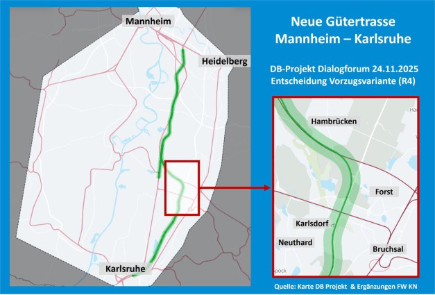 Der Reihe nach: um was geht es noch einmal? Durch die neue Güterbahntrasse zwischen KA und MA soll ein europäischer Engpass im Güterverkehr aufgelöst werden. Aktuell verfolgt die Bahn noch acht Varianten für diese neue Trassenführung. Um diese zu bewerten, bedarf es jedoch neuer Prognosen für Zugzahlen 2040. Diese werden im Frühjahr 2025 erwartet. Dann erst können weitere Entscheidungen getroffen werden und verlässliche Aussagen durch das Bahnprojekt erfolgen. Bis dahin wird es (laut DB-Projektleiter) keine Aussagen geben und werden auch keine Variante ausscheiden.